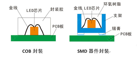 COB是英文chip on board的缩写,指发光芯片集成在基板上封装。它是对现在SMD封装模式的革新,也堪称是对SMD小间距LED的改朝换代。COB实际上是一种封装技术,是把红绿蓝三原色发光芯片直接固晶焊线在PCB板上,然后通过覆胶技术进行保护。而传统的LED屏,即指SMD贴片,是将发光芯片固晶,焊线,点胶封装成一个独立的灯珠,再通过表贴焊接在PCB板上。两种封装结构如下图所示: